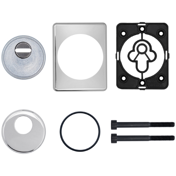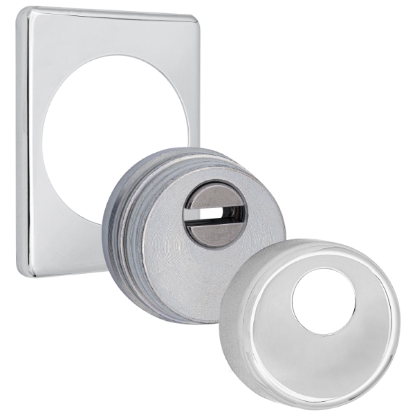 Для монтажу по діаметру протектора робиться отвір в дверному полотні. Кріпиться довкола серцевини стяжними гвинтами M6x40 мм, створюючи монолітну конструкцію з нею. Гвинти виготовлені зі спеціальної сталі, яка допомагає витримати силу навантаження > 2 300 кг на один гвинт. Таким чином, протектор захищає серцевину разом із точкою кріплення в дверях від фізичних та силових методів злому – свердління, виламування та вибивання. Доступу до гвинтів кріплення немає, тому зірвати саму броненакладку надзвичайно складно. Висота (або товщина) складає 25 мм, діаметр – 50 мм. В кольорі “хром полірований” найкраще буде доповнювати двері світлих відтінків.