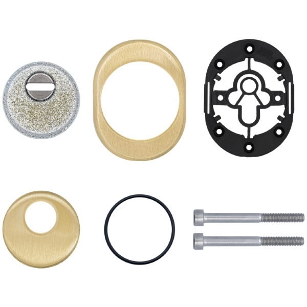 Для монтажу по діаметру протектора робиться отвір в дверному полотні. Кріпиться довкола серцевини стяжними гвинтами M6x40 мм, створюючи монолітну конструкцію з нею. Гвинти виготовлені зі спеціальної сталі, яка допомагає витримати силу навантаження > 2 300 кг на один гвинт. Таким чином, протектор захищає серцевину разом із точкою кріплення в дверях від фізичних та силових методів злому – свердління, виламування та вибивання. Доступу до гвинтів кріплення немає, тому зірвати саму броненакладку надзвичайно складно. Висота (або товщина) складає 25 мм, діаметр – 50 мм. В кольорі “латунь матова” найкраще буде доповнювати двері світлих відтінків.