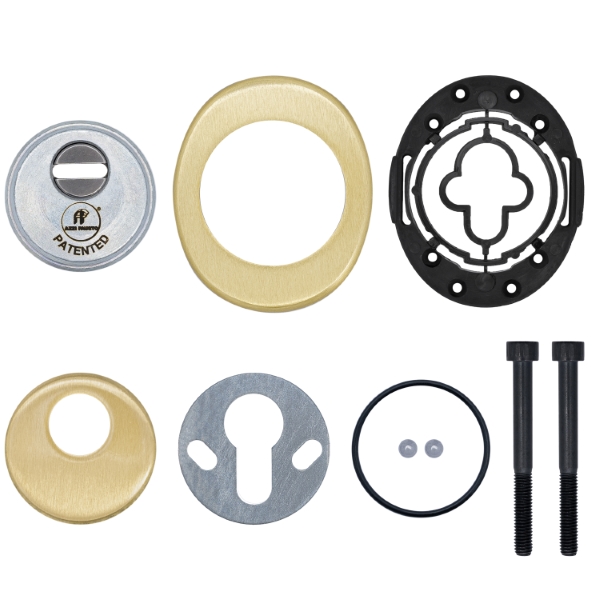 Для монтажу по діаметру тіла протектора робиться отвір в дверному полотні. Кріпиться довкола серцевини стяжними гвинтами M6x40 мм, створюючи монолітну конструкцію з нею. Гвинти виготовлені зі спеціальної сталі, яка допомагає витримати силу навантаження > 2 300 кг на один гвинт. Таким чином, протектор захищає серцевину разом із точкою кріплення в дверях від фізичних та силових методів злому. Висота (або товщина) складає 25 мм, діаметр – 50 мм. В кольорі “латунь матова” найкраще буде доповнювати двері світлих відтінків.