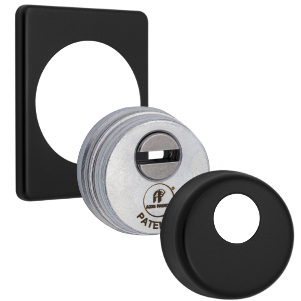 Для монтажу по діаметру тіла протектора робиться отвір в дверному полотні. Кріпиться довкола серцевини стяжними гвинтами M6x40 мм, створюючи монолітну конструкцію з нею. Гвинти виготовлені зі спеціальної сталі, яка допомагає витримати силу навантаження > 2 300 кг на один гвинт. Таким чином, протектор захищає серцевину разом із точкою кріплення в дверях від фізичних та силових методів злому. Висота (або товщина) складає 25 мм, діаметр – 50 мм. В кольорі “чорний матовий” найкраще буде доповнювати двері темних відтінків.