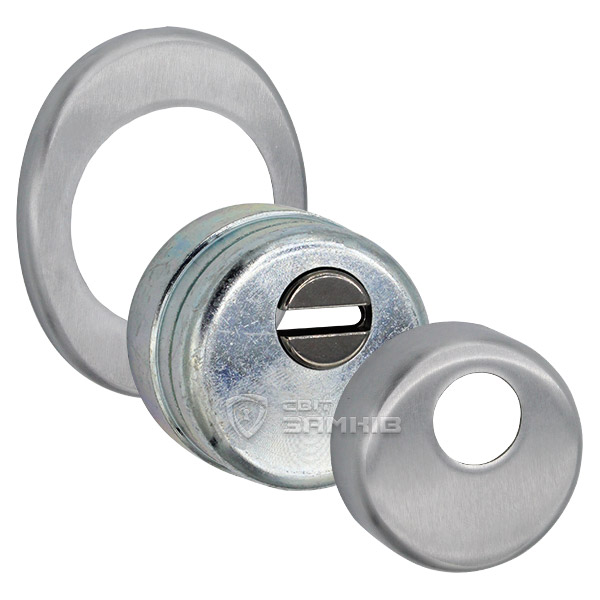Для монтажу по його діаметру робиться отвір в дверному полотні. Кріпиться довкола серцевини стяжними гвинтами, створюючи монолітну конструкцію з нею. Таким чином, протектор захищає її разом із точкою кріплення в дверях від фізичних та силових методів злому — свердління, виламування та вибивання. Доступу до гвинтів кріплення немає і зірвати саму броненакладку надзвичайно складно. Висота (або товщина) її складає 25/33/42 мм, діаметр - 50 мм. Комплектується декоративною накладкою розміром 85х70 мм для надання дверному полотну більш охайного вигляду. В кольорі “матовий хром” найкраще буде доповнювати двері світлих відтінків - від тепло-сірих до бежевих.