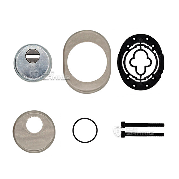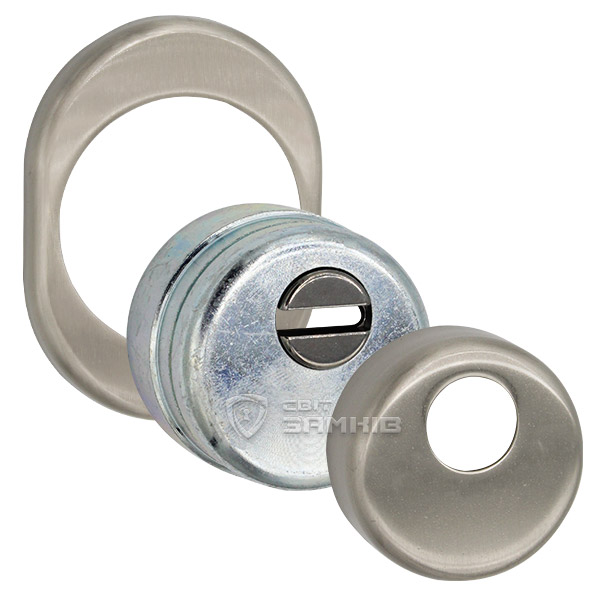 Для монтажу по його діаметру робиться отвір в дверному полотні. Кріпиться довкола серцевини стяжними гвинтами, створюючи монолітну конструкцію з нею. Таким чином, протектор захищає її разом із точкою кріплення в дверях від фізичних та силових методів злому — свердління, виламування та вибивання. Доступу до гвинтів кріплення немає і зірвати саму броненакладку надзвичайно складно. Висота (або товщина) її складає 25/33/42 мм, діаметр - 50 мм. В кольорі “нікель сатин” найкраще буде доповнювати двері світлих відтінків - від тепло-сірих до бежевих.
