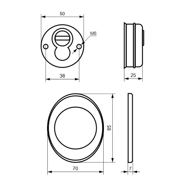 Для монтажу по діаметру протектора робиться отвір в дверному полотні. Кріпиться довкола серцевини стяжними гвинтами, створюючи монолітну конструкцію з нею. Таким чином, протектор захищає її разом із точкою кріплення в дверях від фізичних та силових методів злому — свердління, виламування та вибивання. Доступу до гвинтів кріплення немає і зірвати саму броненакладку надзвичайно складно. Висота (або товщина) її складає 25 мм, діаметр - 50 мм. Комплектується декоративною накладкою розміром 85х70 мм для надання дверному полотну більш охайного вигляду. В кольорі “матовий хром” найкраще буде доповнювати двері світлих відтінків - від тепло-сірих до бежевих.