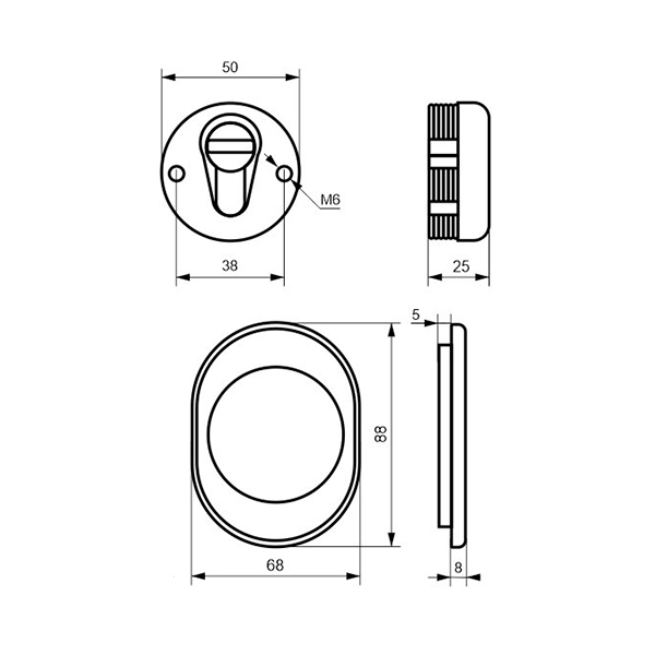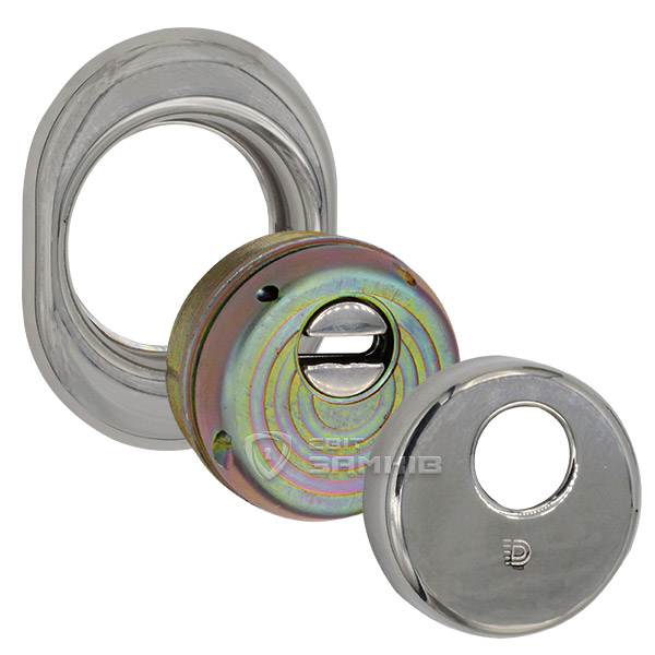 Монтується врізним методом: по його діаметру робиться отвір в дверному полотні. Кріпиться наскрізно довкола серцевини стяжними гвинтами М6 з технологією Flex. Її суть заключається в дрібнішій різьбі та спеціальній насічці. Завдяки цьому та спеціальному виду твердої сталі гвинти витримують навантаження в 5 раз більше, ніж звичайні. Так вони створюють монолітну конструкцію із серцевиною. Таким чином, протектор захищає її разом із точкою кріплення в дверях від фізичних та силових методів злому — свердління, виламування та вибивання. Доступу до гвинтів кріплення немає і зірвати саму броненакладку надзвичайно складно. Також вкручується в посилену зовнішню “юбку”. Висота (або товщина) протектора складає 25 мм, діаметр - 50 мм. Виготовлений із латуні. Монтується на двері за допомогою пластика та саморізів. В кольорі “хром полірований” найкраще буде доповнювати двері світлих відтінків - від тепло-сірих до бежевих.