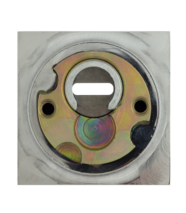 Монтується врізним методом: по його діаметру робиться отвір в дверному полотні. Кріпиться наскрізно довкола серцевини стяжними гвинтами М6 з технологією Flex. Її суть заключається в дрібнішій різьбі та спеціальній насічці. Завдяки цьому та спеціальному виду твердої сталі гвинти витримують навантаження в 5 раз більше, ніж звичайні. Так вони створюють монолітну конструкцію із серцевиною. Таким чином, протектор захищає її разом із точкою кріплення в дверях від фізичних та силових методів злому — свердління, виламування та вибивання. Доступу до гвинтів кріплення немає і зірвати саму броненакладку надзвичайно складно. Також вкручується в посилену зовнішню “юбку”. Висота (або товщина) протектора складає 25 мм, діаметр - 50 мм, зовнішня декоративна накладка - 65х65 мм. Монтується на двері за допомогою захисної шайби та гвинтів М6х40мм або саморізами. В кольорі “хром полірований” найкраще буде доповнювати двері світлих відтінків - від тепло-сірих до бежевих.