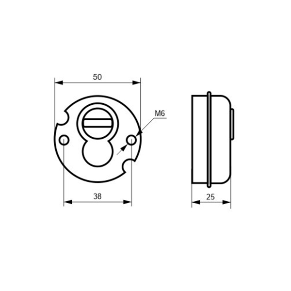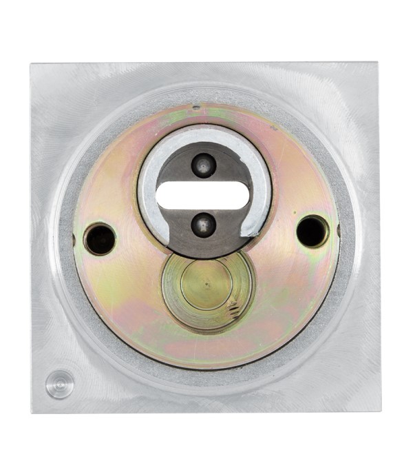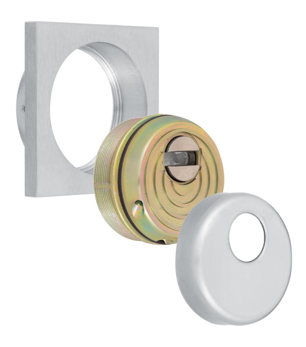Монтується врізним методом: по його діаметру робиться отвір в дверному полотні. Кріпиться наскрізно довкола серцевини стяжними гвинтами М6 з технологією Flex. Її суть заключається в дрібнішій різьбі та спеціальній насічці. Завдяки цьому та спеціальному виду твердої сталі гвинти витримують навантаження в 5 раз більше, ніж звичайні. Так вони створюють монолітну конструкцію із серцевиною. Таким чином, протектор захищає її разом із точкою кріплення в дверях від фізичних та силових методів злому — свердління, виламування та вибивання. Доступу до гвинтів кріплення немає і зірвати саму броненакладку надзвичайно складно. Також вкручується в посилену зовнішню “юбку”. Висота (або товщина) протектора складає 25 мм, діаметр - 50 мм, зовнішня декоративна накладка - 65х65 мм. Монтується на двері за допомогою захисної шайби та гвинтів М6х40мм або саморізами. В кольорі матової нержавіючої сталі найкраще буде доповнювати двері світлих відтінків - від тепло-сірих до бежевих.