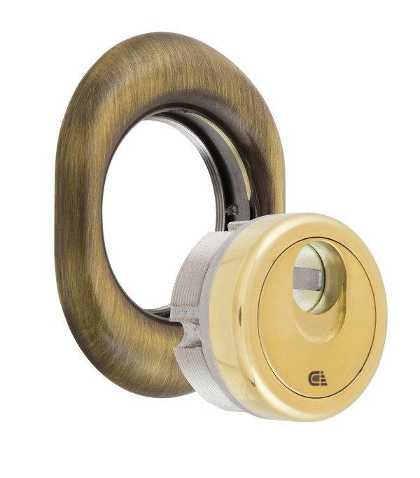 Монтується врізним методом: по його діаметру робиться отвір в дверному полотні. Кріпиться наскрізно довкола серцевини стяжними гвинтами М6 з технологією Flex. Її суть заключається в дрібнішій різьбі та спеціальній насічці. Завдяки цьому та спеціальному виду твердої сталі гвинти витримують навантаження в 5 раз більше, ніж звичайні. Так вони створюють монолітну конструкцію із серцевиною. Таким чином, протектор захищає її разом із точкою кріплення в дверях від фізичних та силових методів злому — свердління, виламування та вибивання. Доступу до гвинтів кріплення немає і зірвати саму броненакладку надзвичайно складно. Також вкручується в зовнішню “юбку” та фіксується гужоном. Додаткового захисту від свердління дають встановлені в отвори кріплення загартовані кульки. Висота (або товщина) протектора складає 25 мм, діаметр - 50 мм. Монтується на двері за допомогою пластика та саморізів. В кольорі “бронза сатин” найкраще буде доповнювати двері з пильно-землистої палітри.