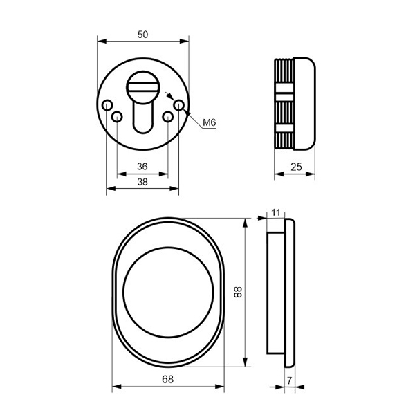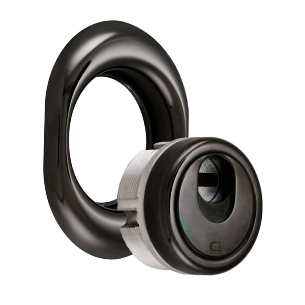 Монтується врізним методом: по його діаметру робиться отвір в дверному полотні. Кріпиться наскрізно довкола серцевини стяжними гвинтами М6 з технологією Flex. Її суть заключається в дрібнішій різьбі та спеціальній насічці. Завдяки цьому та спеціальному виду твердої сталі гвинти витримують навантаження в 5 раз більше, ніж звичайні. Так вони створюють монолітну конструкцію із серцевиною. Таким чином, протектор захищає її разом із точкою кріплення в дверях від фізичних та силових методів злому — свердління, виламування та вибивання. Доступу до гвинтів кріплення немає і зірвати саму броненакладку надзвичайно складно. Також вкручується в зовнішню “юбку” та фіксується гужоном. Додаткового захисту від свердління дають встановлені в отвори кріплення загартовані кульки. Висота (або товщина) протектора складає 25 мм, діаметр - 50 мм. Монтується на двері за допомогою пластика та саморізів. В чорному хромованому кольорі найкраще буде доповнювати двері аналогічних відтінків для того, щоб максимально уникнути контрастів та не привертати зайвої уваги.