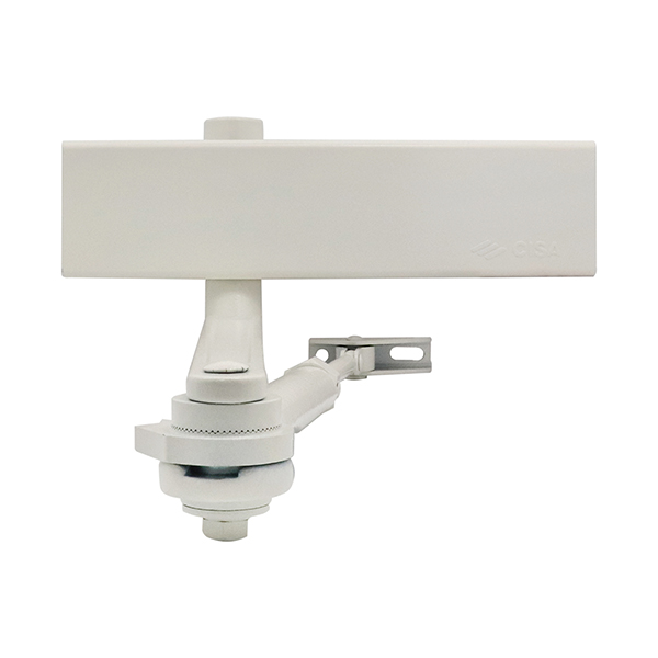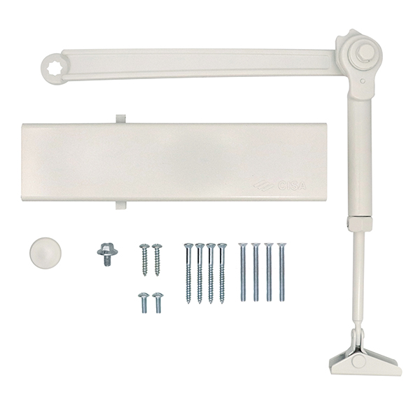 CISA C1611.03 – це надійний дотягувач із серії Professional Plus2, що призначений для накладного монтажу на внутрішніх і зовнішніх дверях. Він підходить для дверних полотен із максимальною вагою до 80 кг і шириною до 1100 мм. На передній частині корпусу розташовані регулювальні гвинти, які дозволяють налаштувати основну швидкість зачинення (в межах 180°-15°), швидкість захлопування (15°-0°) та функцію гальма відчинення (180°-50°). Ця функція, також відома як "вітрове гальмо," забезпечує додатковий захист дверного полотна, запобігаючи його удару об стіну чи пошкодженню механізму тяги.