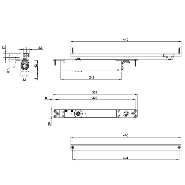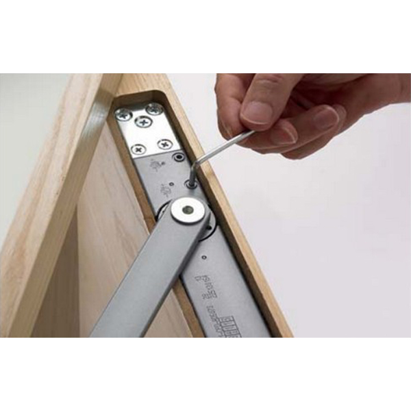 Безпосередньо на корпусі є можливість регулювання зусилля закриття в межах EN 2-4. Регулювання швидкості здійснюється в межах від 120˚ до 7˚. Також окремо регулюється кінцевий дохлоп (latch action) в останні 7˚. Він дозволяє контролювати силу притиску дверей. В комплектації присутня ковзна тяга без фіксації дверного полотна у відкритому положенні.