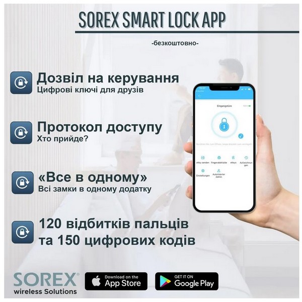 Відкрити двері з даним смарт-замком можна за допомогою: відбитка пальця, пароля, брелка або NFC-мітки, RFID-карти, смартфона з використанням інтернету та застосунку Sorex Smart Lock. Відмикання механічним ключем також можливе – у нижній частині планки для цього є ключовий отвір. Проте даний спосіб використовують найчастіше для екстреного відкриття. Також він чудово приховує всі монтажні отвори та додає естетичного вигляду будь-яким дверям.
