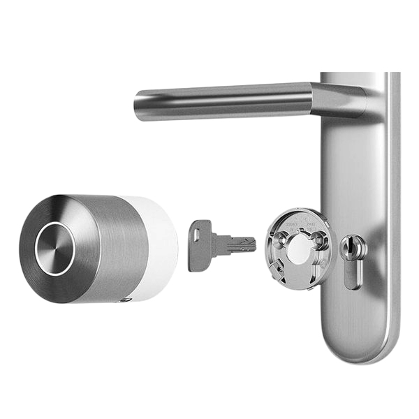 Ключ-ключ: обов’язкова вимога до серцевини – вона повинна працювати у режимі “антипаніка” (керування доступне ззовні, навіть якщо ключ вставлений всередині). В циліндр вставляється активний ключ, на який монтується спеціальний кронштейн. Після цього встановлюється замок NUKI Smart Lock 5.0 Pro.