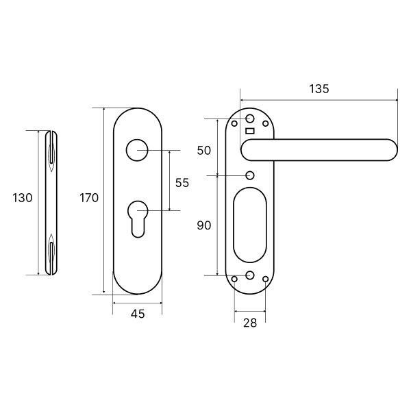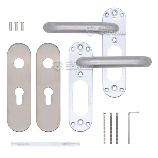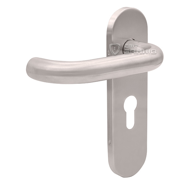 Колір матової нержавіючої сталі чудово поєднується з дверним полотном в сірих відтінках, а дверям в темних тонах додасть трохи контрасту. Вдалий вибір ручки на планці залежить від міжосьової відстані, вона може бути різною і зумовлена механізмом замка. Ця модель підходить тільки для механізмів замка з міжосьовою відстанню 55 мм.