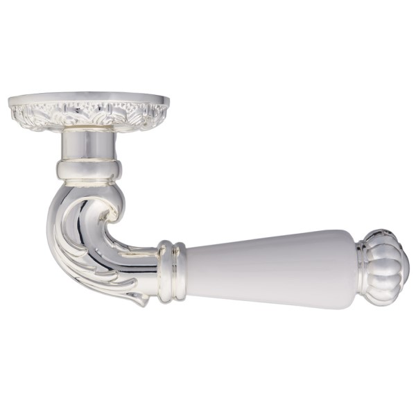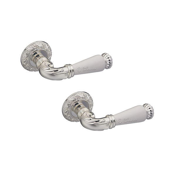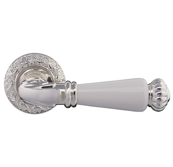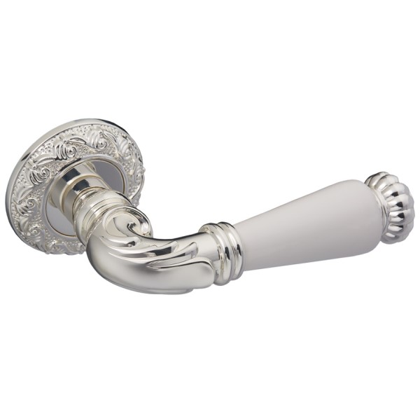 Комплект роздільних ручок французької ТМ "GAVROCHE" - відмінна якість і довговічність роботи. Ручки суцільнолиті, важкі, виготовлені із цинкового сплаву. Кольоровий відтінок наноситься спеціальним методом – гальваніки. Це гарантує термін служби покриття протягом 60 місяців - офіційна гарантія виробника. Зручна форма нажимної частини зробить користування приємним. Кругла основа ручки гарно виглядатиме на полотнах із плавними вигнутими лініями. Поєднання різьбленого дизайну в кольорі італійське срібло та білосніжна вставка робить модель елегантною і витонченою. Саме ця ручка зробить будь-які білі двері витвором класичного мистецтва. В ручках такого типу не видно отворів для кріплення, вони прикриваються зовнішньою кришкою розети. Ручка просто і легко монтується. Залежно від встановленого замка та товщини дверей, ручку можна зафіксувати на стяжні гвинти або саморізи.