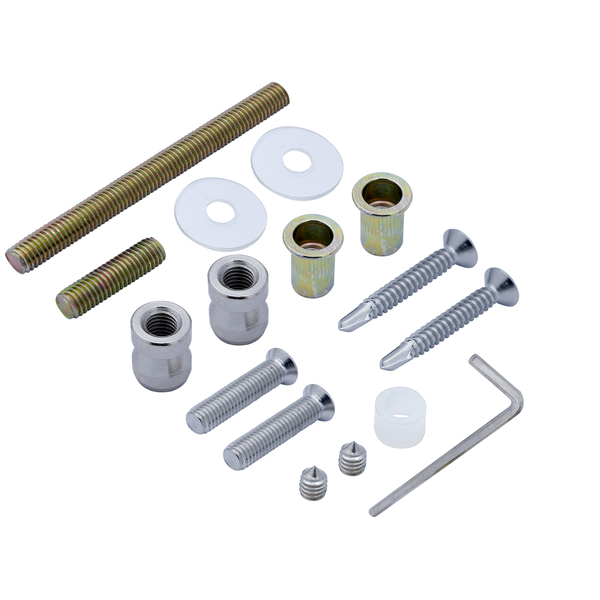 Половинка ручки-скоби фіксується за допомогою комплектних саморізів із нержавіючої сталі. На них вставляються спеціальні втулки та безпосередньо вкручуються в полотно. Далі насаджується ручка-скоба та фіксується гужоном. Якщо товщина профілю складає менше 3 мм, то в комплекті також є різьбові заклепки і гвинти з нержавіючої сталі для надійнішого монтажу.