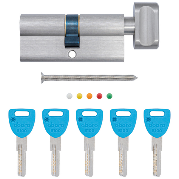 Циліндр ABARO B100 керується ключами профільного (лазерного) типу. Вони виготовлені із латуні з нікельованим покриттям. Ключі мають подовжену шийку леза, що робить можливим їхнє використання з будь-якими протекторами циліндрів.