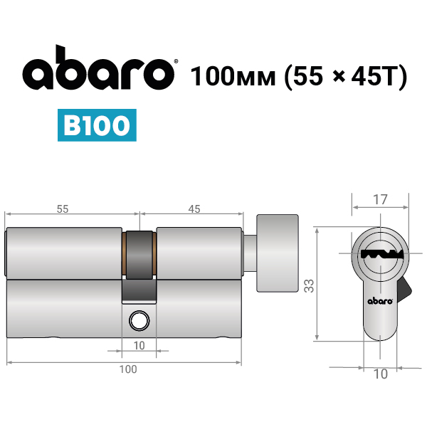 Опис Циліндр ABARO B100 100T (55*45T) Ni нікель сатин 5 ключів
