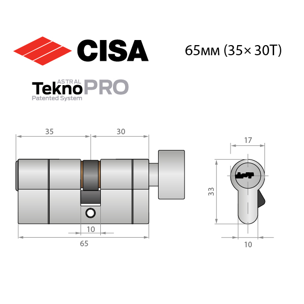 Опис Циліндр CISA Astral Tekno PRO 65T (35*30T) нікель матовий 3 ключі