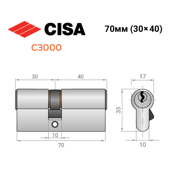 - Циліндр CISA C3000 70 (30*40) нікель матовий 3 ключі ⭐