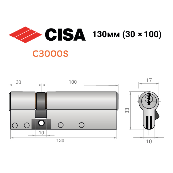 Купити циліндр CISA C3000S 130 (30*100) нікель в роздріб і гуртом можна на нашому сайті.