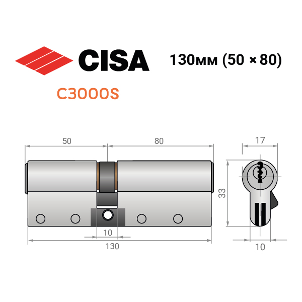 Купити циліндр CISA C3000S 130 (50*80) нікель в роздріб і гуртом можна на нашому сайті.