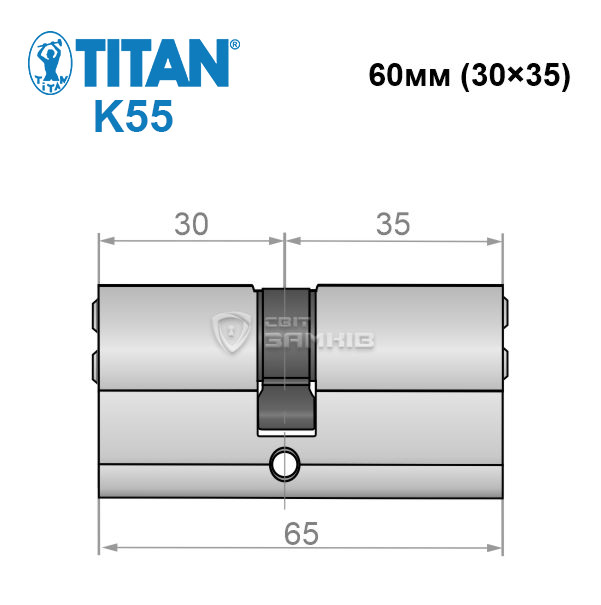 Купити циліндр TITAN K55 65 (30*35) нікель сатин в роздріб і гуртом можна на нашому сайті.