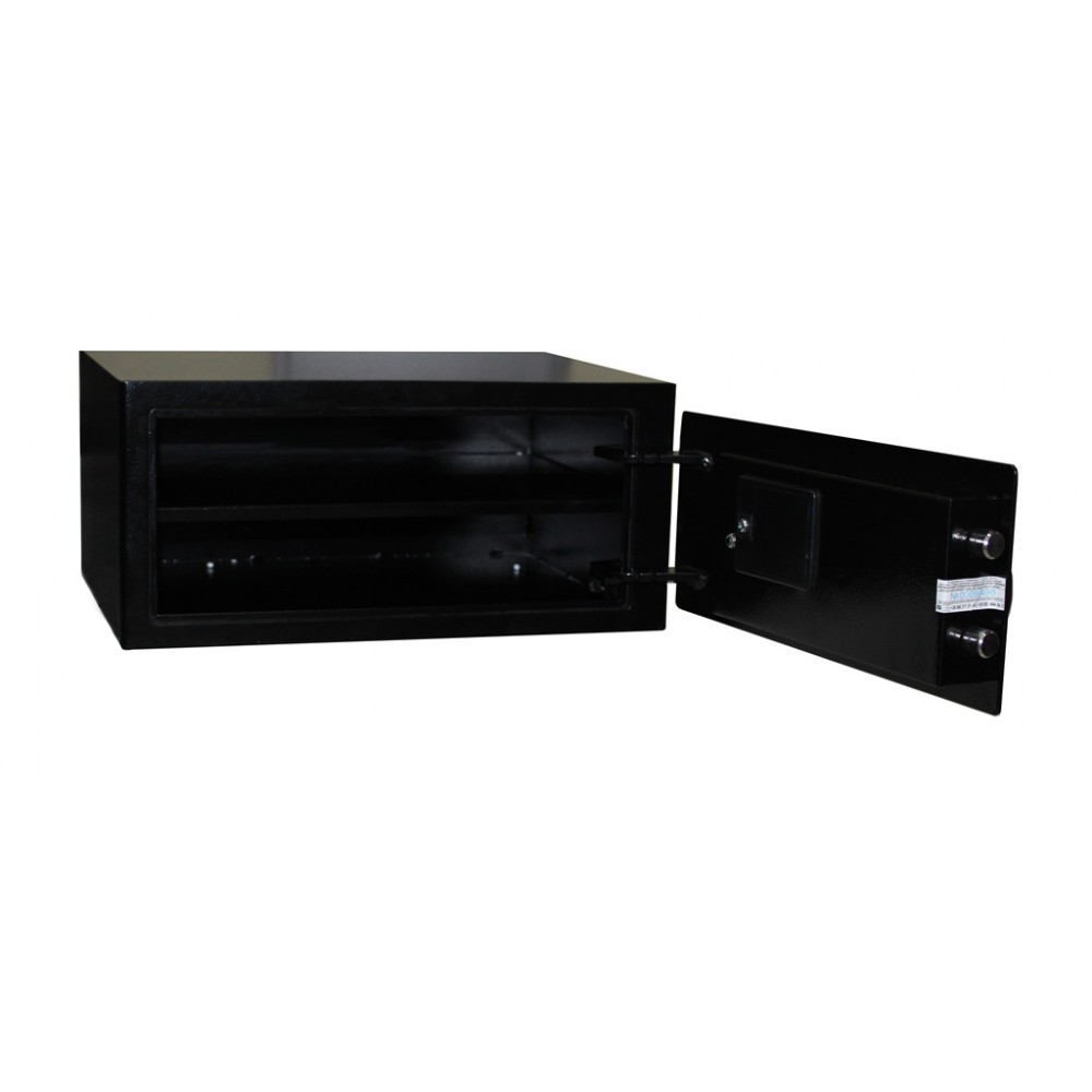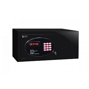 Корпус і двері сейфа виготовлені із металу завтовшки 3 мм. Закривається електронним кодовим замком. Він обладнаний дисплеєм для відображення коду та помилок. Як опція, можлива функція ведення журналу операцій та система зчитування даних. Особливістю цієї моделі є наявність ключового замка. Він виступає в ролі аварійного і застосовується лише для відкривання в тому випадку, якщо Ви забули код до електронного замка або не хочете його вводити. Замикання здійснюється ригелями діаметром 18 мм. В чорному кольорі відмінно доповнить будь-яке сучасне приміщення.