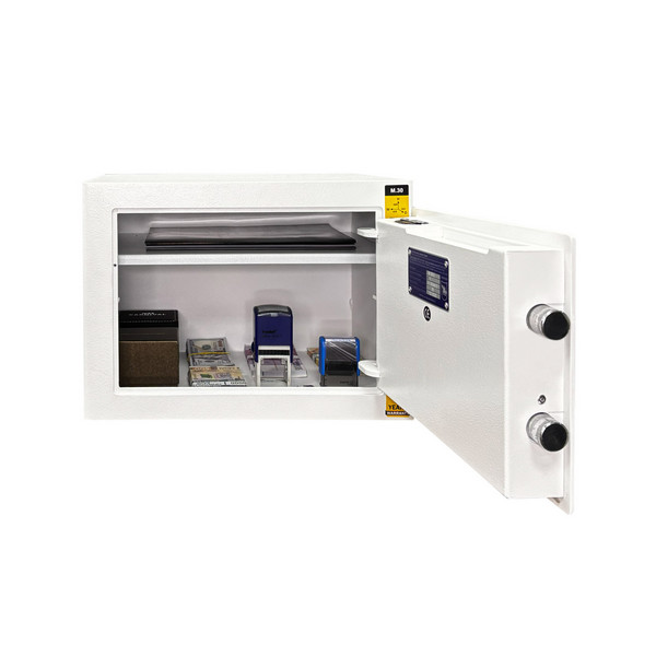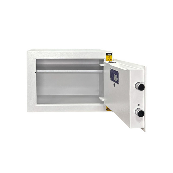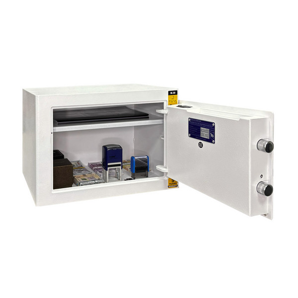 Корпус і двері сейфа виготовлені із металу завтовшки 3 та 4 мм відповідно. Разом із електронним кодовим замком M-LOCKS (Нідерланди) це створить суттєву перепону для зловмисника. Замикання здійснюється товстими обертовими ригелями діаметром 25 мм. Вони забезпечать практичний захист від можливості їх перепилювання. Петлі в формі антизрізів мають внутрішнє виконання, тому їх збити абсолютно неможливо. В білому кольорі відмінно доповнить будь-яке сучасне приміщення.