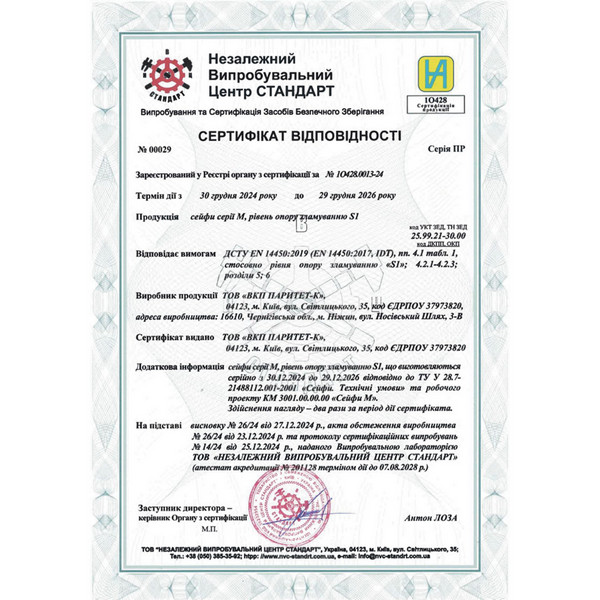 У комплекті йдуть інструкція з експлуатації та паспорт з серійним номером. Гарантія на конструкцію сейфа складає 5 років, на замок 1 рік.