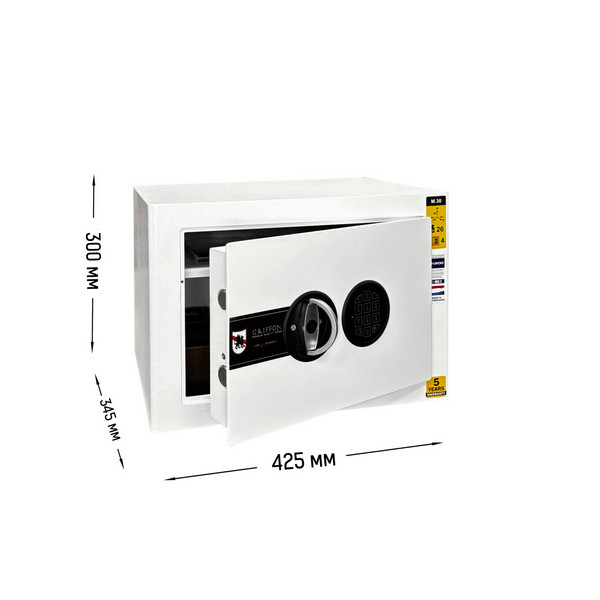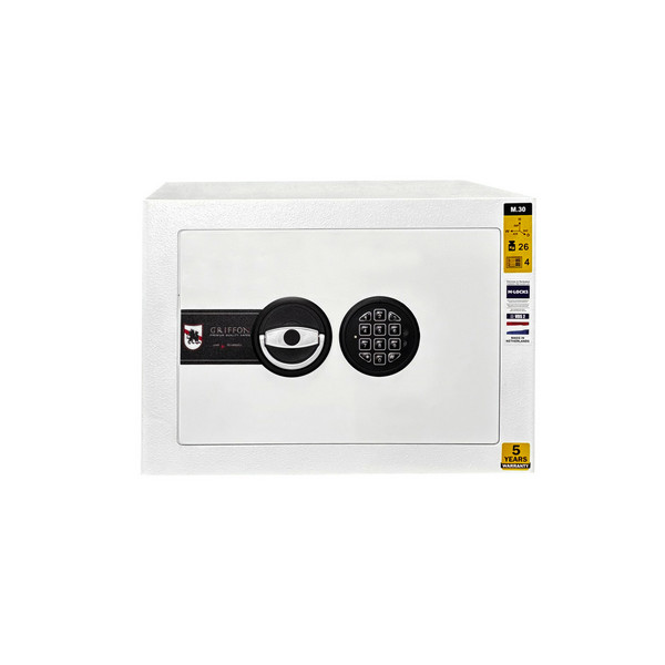 GRIFFON M.30.Е WHITE GLOSS – це зламостійкий меблевий сейф, який володіє компактними розмірами і при цьому досить місткий для побутових потреб. Його без проблем можна розмістити всередині меблів або у будь-якому зручному місці. Сейф відповідає європейському стандарту ДСТУ EN 14450 та має S1 рівень опору до зламу. Це означає, що сейф добре протистоїть вандальному зламу. Для надійності кріплення передбачені отвори для анкерних гвинтів. Це дозволить закріпити сейф до підлоги або стіни.
