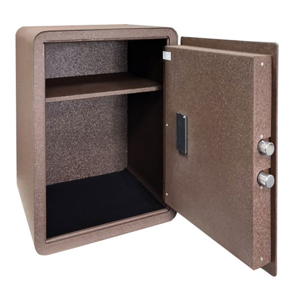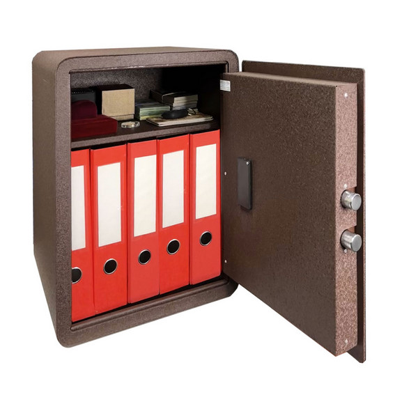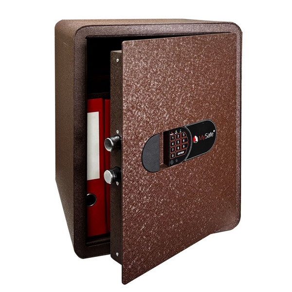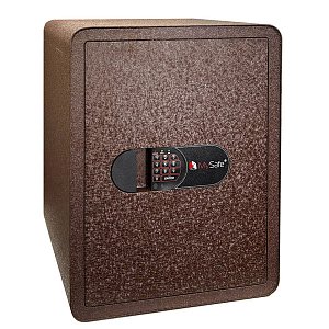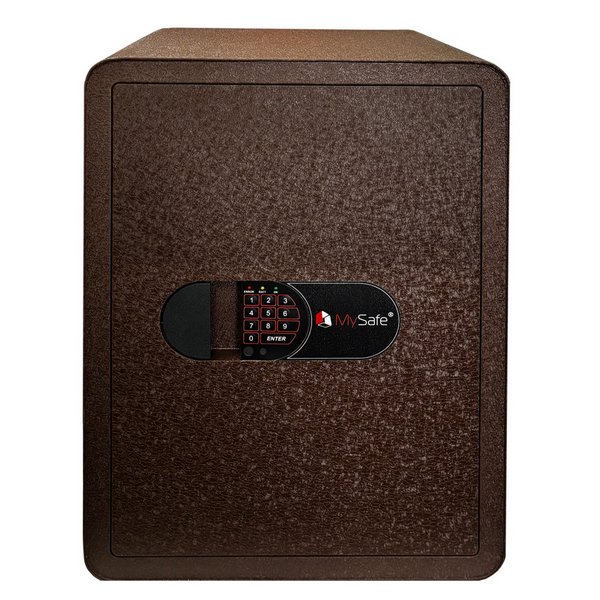 Корпус та двері сейфа виготовлені із металу завтовшки 2 і 4 мм відповідно. Закривається електронним кодовим замком MySafe. Замикання здійснюється двома товстими обертовими ригелями діаметром 25 мм. Вони забезпечать практичний захист від можливості їх перепилювання. Посилені сталеві внутрішні петлі дозволяють відчиняти дверцята сейфа на 90 градусів. В коричневому кольорі відмінно доповнить будь-яке сучасне приміщення. Порошкова фарба не проводить електрику та має високі антикорозійні властивості. Це в свою чергу надійно захищає метал від вологи та впливу навколишнього середовища.