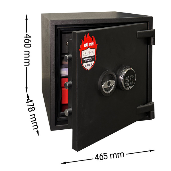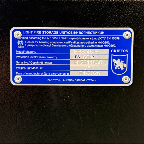 GRIFFON FRS.45.Е із серії нової FRS відноситься до вогнестійких схованок. Вона здатна захищати цінності від дії вогню протягом 60 хвилин (клас LFS 60 P). Це означає, що під час пожежі температура всередині сейфу не підніметься вище 170°C, чого достатньо для збереження паперових документів. Додатково по периметру дверей встановлена німецька термострічка BASF в два контури, яка при високих температурах розширюється і ніби “запечатує” сейф, тим самим додатково захищаючи вміст від вогню. Тому це ідеальний вибір для приміщень, у яких є ризик виникнення пожежі. Відносно невеликі габарити дозволять розмістити його практично будь де в приміщенні. Для надійності кріплення внизу сейфа передбачені отвори для анкерних гвинтів. Це дозволить закріпити його до підлоги.