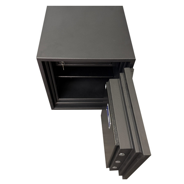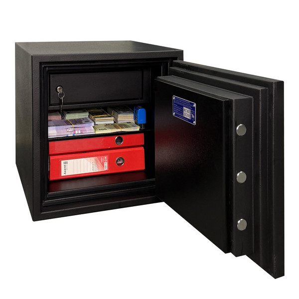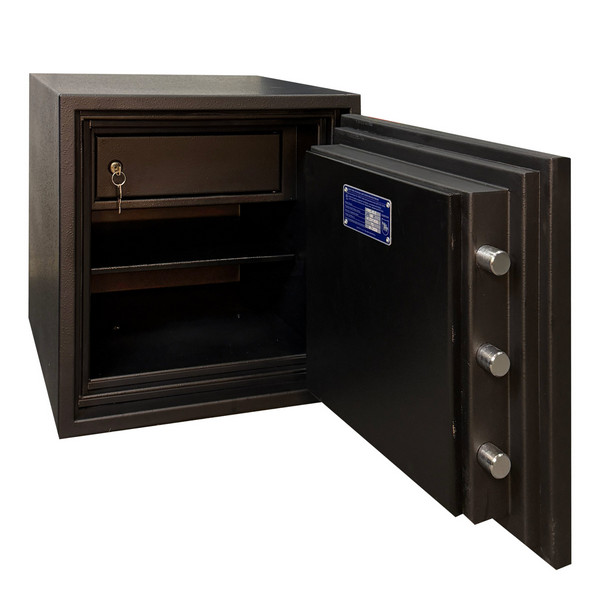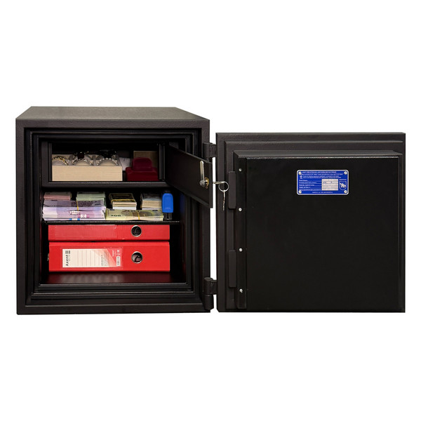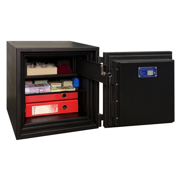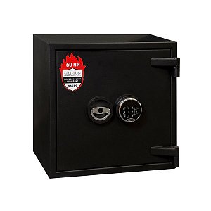 Товщина спеціального вогнестійкого наповнення дверей і корпусу складає 53 мм. Зачиняється сейф електронним кодовим замком. Це створить суттєву перепону для зловмисника. Замикання здійснюється ригельною системою. Товсті обертові ригеля діаметром 25 мм забезпечать практичний захист від можливості їх перепилювання. Додатково з боку петель є антизрізи. Конструкція передбачає спеціальні «кармани» для ригелів і антизрізів, які забезпечують щільне прилягання дверей по всьому периметру та підвищують стійкість сейфа до силових методів злому. В чорному кольорі сейф відмінно доповнить будь-яке сучасне приміщення.