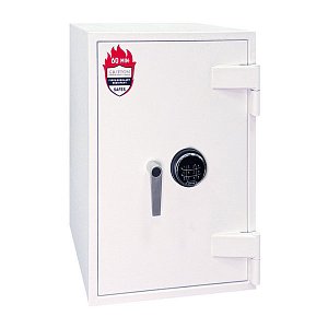 Товщина спеціального вогнестійкого наповнення дверей і корпусу складає 53 мм. Зачиняється сейф електронним кодовим замком. Це створить суттєву перепону для зловмисника. Замикання здійснюється ригельною системою. Товсті обертові ригеля діаметром 25 мм забезпечать практичний захист від можливості їх перепилювання. Додатково з боку петель є антизрізи. Конструкція передбачає спеціальні «кармани» для ригелів і антизрізів, які забезпечують щільне прилягання дверей по всьому периметру та підвищують стійкість сейфа до силових методів злому. В білому кольорі сейф відмінно доповнить будь-яке сучасне приміщення.