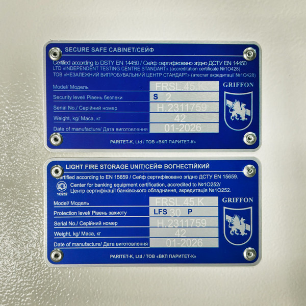 Дана модель GRIFFON FRSL.45.K CREAM із серії FRSL відноситься до вогнестійких. Вона здатна захищати цінності від дії вогню протягом 30 хвилин (клас LFS 30 P). Це означає, що під час пожежі температура всередині сейфу не підніметься вище 170°C, чого достатньо для збереження паперових документів. Додатково по периметру дверей встановлена німецька термострічка BASF, яка при високих температурах розширюється і ніби “запечатує” сейф, тим самим додатково захищаючи вміст від вогню. Тому це ідеальний вибір для приміщень, у яких є ризик виникнення пожежі. Відносно невеликі габарити дозволять розмістити його практично будь де в приміщенні. Для надійності кріплення внизу сейфа передбачені отвори для анкерних болтів. Це дозволить закріпити його до підлоги.