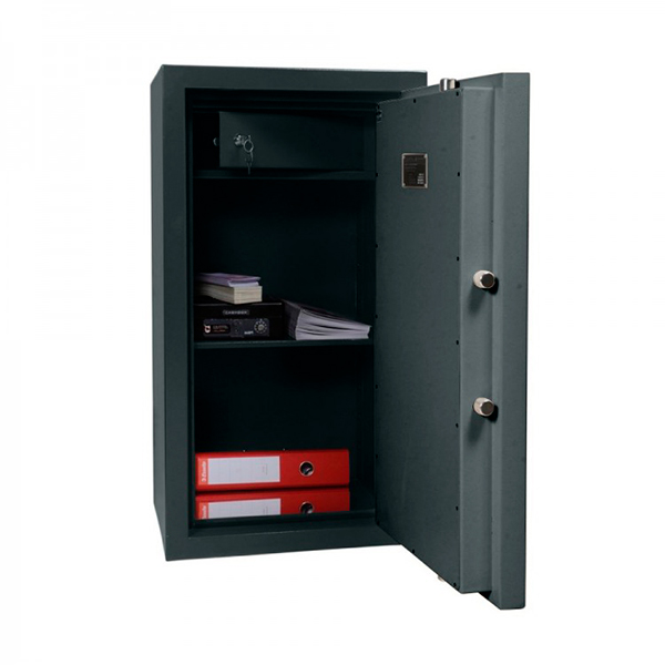 Товщина спеціального вогнестійкого наповнення дверей і корпусу складає 43 мм. Зачиняється сейф електронним кодовим замком. Це створить суттєву перепону для зловмисника. Кодонабирач обладнаний приємною підсвіткою. Замикання здійснюється ригельною системою тристоронньої дії. Товсті обертові ригеля діаметром 25 мм забезпечать практичний захист від можливості їх перепилювання. Додатково з боку петель є антизрізи. В антрацитово-сірому кольору сейф відмінно доповнить будь-яке сучасне приміщення.
