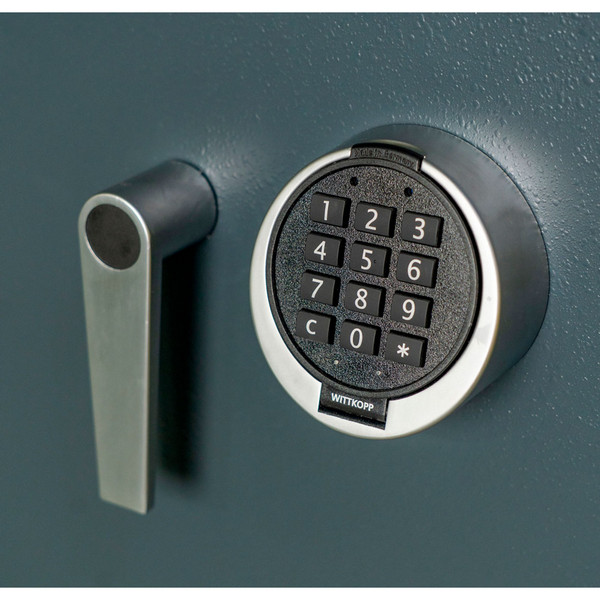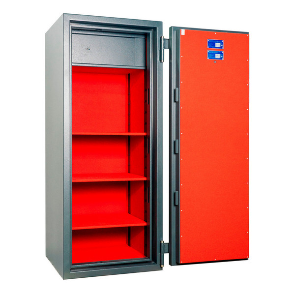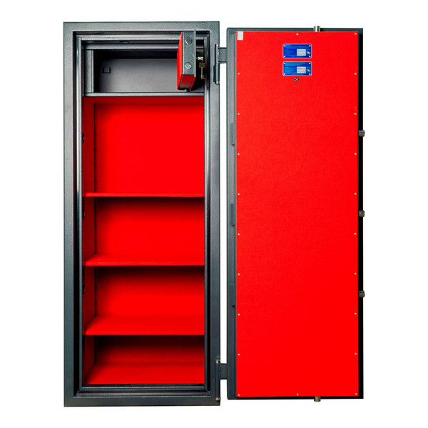 Корпус сейфа заповнений спеціальним фортифікаційним бетоном. Товщина захисного шару складає 40 мм. По периметру дверей розміщено термострічку, яка під дією високих температур розширюється та герметизує отвір сейфу, захищаючи вміст від проникнення високих температур. Закривається сертифікованим електронним сейфовим замком Carl Wittkopp з можливістю аварійного відкривання ключем з прихованим доступом до замку. У комплект входить два аварійних ключа. Замикання здійснюється ригельною системою тристоронньої дії. Товсті обертові ригеля діаметром 25 мм забезпечать практичний захист від можливості їх перепилювання. Додатково з боку петель є антизрізи. В конструкції сейфа є надміцні сталеві пластини товщиною 4 мм, що захищають від висвердлювання або вибивання замків та ригелів.