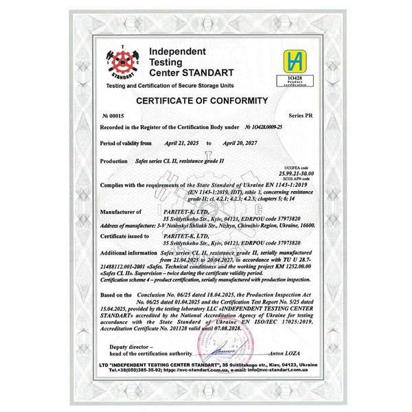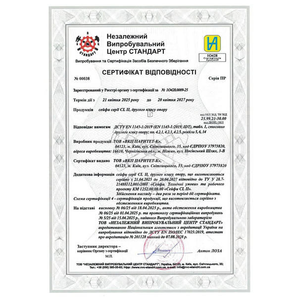 | Клас зламостійкості | II клас (Європейська сертифікація) | |