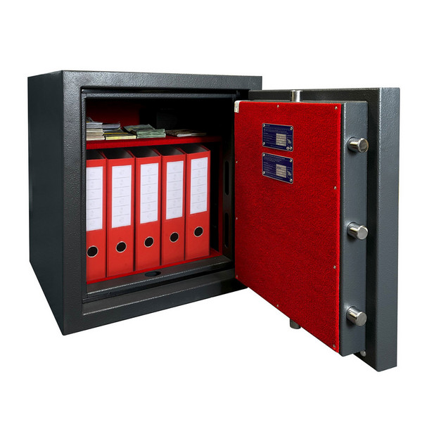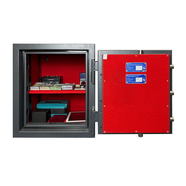Корпус сейфа заповнений спеціальним фортифікаційним бетоном. Товщина захисного шару складає 40 мм. По периметру дверей розміщено термострічку, яка під дією високих температур розширюється та герметизує отвір сейфу, захищаючи вміст від проникнення високих температур. Закривається сертифікованим електронним сейфовим замком Carl Wittkopp з можливістю аварійного відкривання ключем з прихованим доступом до замку. У комплект входить два аварійних ключа. Замикання здійснюється ригельною системою тристоронньої дії. Товсті обертові ригеля діаметром 25 мм забезпечать практичний захист від можливості їх перепилювання. Додатково з боку петель є 3 антизрізи. В конструкції сейфа є надміцні сталеві пластини товщиною 4 мм, що захищають від висвердлювання або вибивання замків та ригелів.