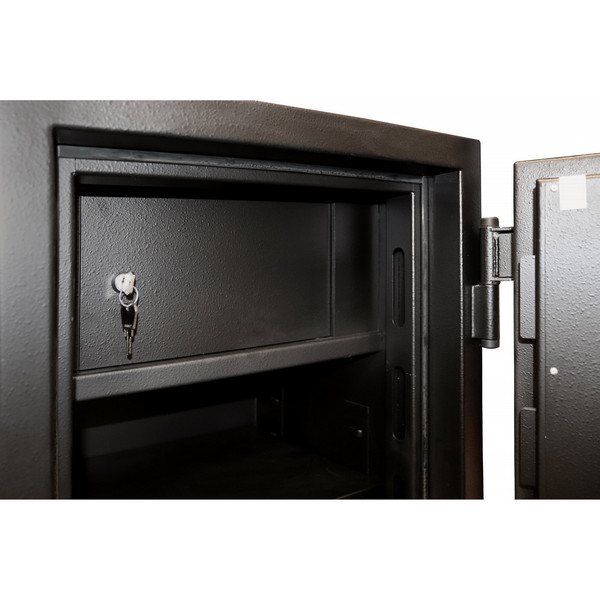 Внутрішній простір має розміри: 574 мм по висоті, 420 мм по ширині та 363 мм по глибині. Є полиця, яка дозволить розділити, наприклад, документи і гроші. Її можна легко зняти, якщо буде необхідність зберігати об'ємні предмети. Простір всередині сейфа дозволяє легко помістити звичайні папки з документами формату А4 в горизонтальному положенні. Додатково в цій моделі є окремий касовий відділ (трейзер). Він зачиняється на ключ.