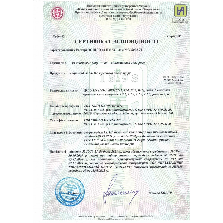 У комплекті йде інструкція з експлуатації та паспорт з серійним номером. Гарантія на конструкцію сейфа складає 5 років, на замок 1 рік.