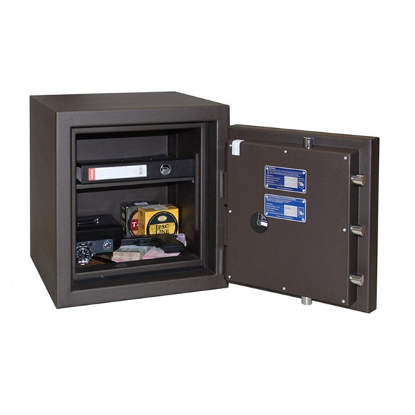 Корпус сейфа заповнений спеціальним фортифікаційним бетоном. Товщина захисного шару складає 40 мм. Разом із механічним кодовим сейфовим замком це створить суттєву перепону для зловмисника. Замикання здійснюється ригельною системою тристоронньої дії. Товсті обертові ригеля діаметром 25 мм забезпечать практичний захист від можливості їх перепилювання. Додатково з боку петель є антизрізи. В коричневому кольорі сейф відмінно доповнить будь-яке сучасне приміщення в темних тонах.