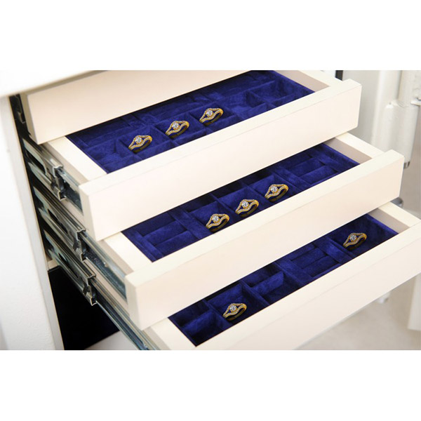 Внутрішній простір має розміри: 390 мм по висоті, 380 мм по ширині і 296 мм по глибині. Фішкою є наявність 4-х висувних ящиків для зручного зберігання різного роду невеликих прикрас. Саме тому буде ідеальним для використання в ювелірних майстернях. Нижче є відділ, який дозволить помістити більшого розміру цінності. Об'єм всередині сейфа оздоблений приємним матеріалом.