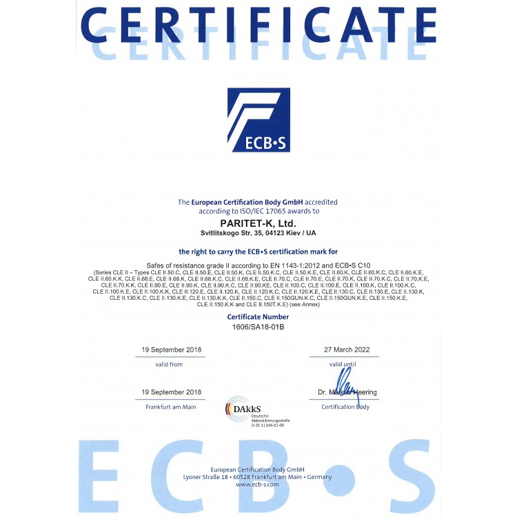 Український виробник ПАРИТЕТ-К є одним із найкращих та найпрогресивніших в сфері проектування та виготовлення сейфів будь-якої категорії. Дана модель GRIFFON CLE.II.50 E відноситься до вогнезламостійких. Вона здатна захищати цінності від зламу (ІІ клас по EN 1143-1) і дії вогню (клас LFS 30 P). Це означає, що під час пожежі протягом 30 хвилин температура всередині сейфу не підніметься вище 170°C, чого достатньо для збереження паперових документів. Відносно компактні розміри дозволяють розташувати сейф практично будь-де в приміщенні. Для надійності кріплення передбачені отвори для анкерних болтів. Це дозволить закріпити його до підлоги.