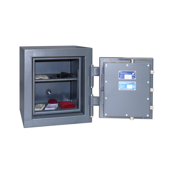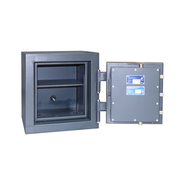 Корпус сейфа заповнений спеціальним фортифікаційним бетоном. Товщина захисного шару складає 55 мм. Разом із ключовим сейфовим замком STUV це створить суттєву перепону і для зловмисника. Замикання здійснюється ригельною системою тристоронньої дії. Товсті обертові ригеля діаметром 25 мм забезпечать практичний захист від можливості їх перепилювання. Додатково з боку петель є антизрізи. Зручності користування додає ергономічна ручка. В темно-сірому кольорі з ефектом молоткової емалі сейф відмінно доповнить будь-яке сучасне приміщення та не буде привертати зайву увагу.