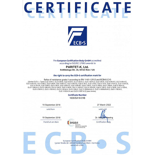 Український виробник ПАРИТЕТ-К є одним із найкращих та найпрогресивніших в сфері проектування та виготовлення сейфів будь-якої категорії. Дана модель GRIFFON CLE.II.68 K відноситься до вогнезламостійких. Вона здатна захищати цінності від зламу (ІІ клас по EN 1143-1) і дії вогню (клас LFS 30 P). Це означає, що під час пожежі протягом 30 хвилин температура всередині сейфу не підніметься вище 170°C, чого достатньо для збереження паперових документів. Для надійності кріплення передбачені отвори для анкерних болтів. Це дозволить закріпити його до підлоги.