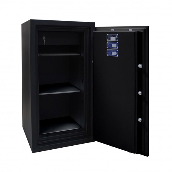 Корпус і двері сейфа заповнені спеціальним вогнестійким бетоном. Товщина захисного шару складає 72 мм. Разом із ключовим сейфовим замком STUV це створить суттєву перепону для зловмисника. Замикання здійснюється ригельною системою чотиристоронньої дії. Товсті обертові ригеля діаметром 25 мм забезпечать практичний захист від можливості їх перепилювання. В чорному кольорі сейф відмінно доповнить будь-яке сучасне приміщення та не буде виділятись.