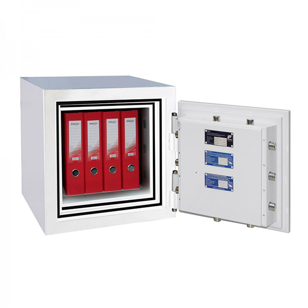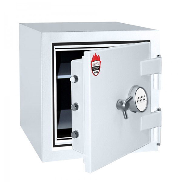 Корпус і двері сейфа заповнені спеціальним вогнестійким бетоном. Товщина захисного шару складає 72 мм. Разом із електронним кодовим сейфовим замком M-LOCKS це створить суттєву перепону для зловмисника. Замикання здійснюється ригельною системою чотиристоронньої дії. Товсті обертові ригеля діаметром 25 мм забезпечать практичний захист від можливості їх перепилювання. В білому кольорі сейф відмінно доповнить будь-яке сучасне приміщення в світлих тонах та не буде виділятись.