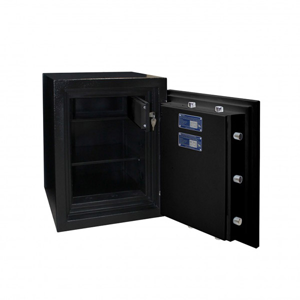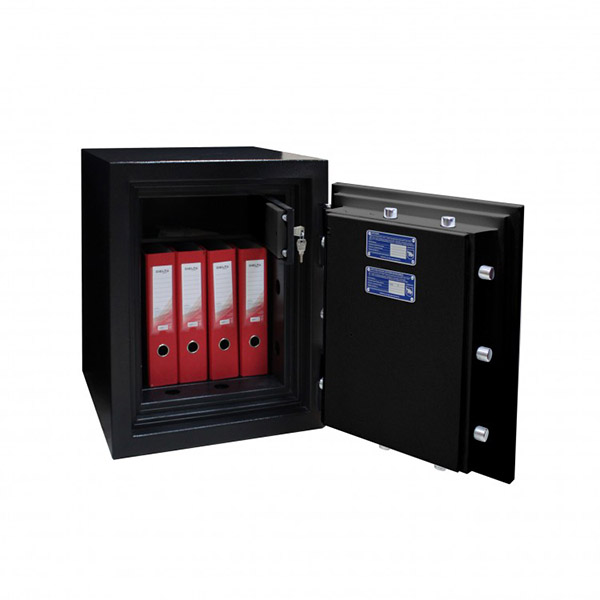 Корпус і двері сейфа заповнені спеціальним вогнестійким бетоном. Товщина захисного шару складає 72 мм. Разом із ключовим сейфовим замком STUV це створить суттєву перепону для зловмисника. Замикання здійснюється ригельною системою чотиристоронньої дії. Товсті обертові ригеля діаметром 25 мм забезпечать практичний захист від можливості їх перепилювання. В чорному кольорі сейф відмінно доповнить будь-яке сучасне приміщення та не буде виділятись.