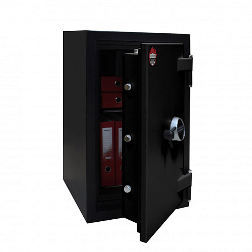 Корпус і двері сейфа заповнені спеціальним вогнестійким бетоном. Товщина захисного шару складає 72 мм. Разом із електронним кодовим замком SmartLock це створить суттєву перепону для зловмисника. Замикання здійснюється ригельною системою чотиристоронньої дії. Товсті обертові ригеля діаметром 25 мм забезпечать практичний захист від можливості їх перепилювання. В чорному кольорі сейф відмінно доповнить будь-яке сучасне приміщення та не буде виділятись.